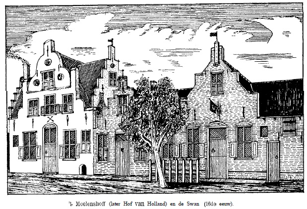In het Leidsch Jaarboekje van 1910 wordt de geschiedenis van het “Hof van Holland“, voorheen “Het Moelenshoff” , breed uitgemeten. Er is een mooi citaat uit Noordwyckse Arkadia van Jacob van der Valk: