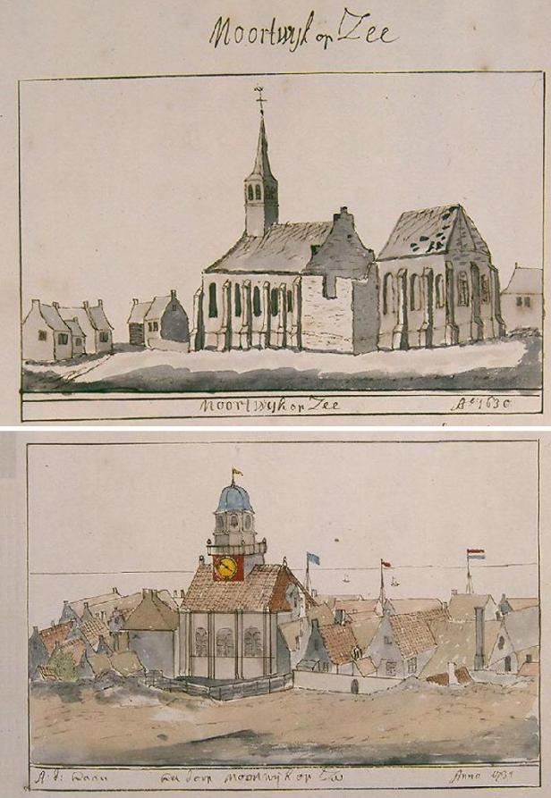 Op de bovenste: een voorstelling van een kerkje in 1630, waarvan een gedeelte naar de gallemiezen is gegaan, zo te zien door toedoen van menselijke hand. Ik vermoed dat het een stelletje beeldenbestormers waren, notoire protestanten die een lafhartige aanval pleegden op het katholieke kerkje aan zee.