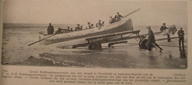 In mijn tijd kwamen er al helicopters aan te pas en werd de reddingsboot de zee in gereden door een bulldozer-achtige machine. Veel lawaai. Spektakel, die reddingsdemonstraties. Maar in 1927 ging het er rustiger aan toe. In “De Prins” van 30 april van dat jaar stond deze foto. Het onderschrift vermeldt dat het allemaal was tot meerdere eer en glorie van Jan van Kan (die driedubbelrijmerige naam alleen al).