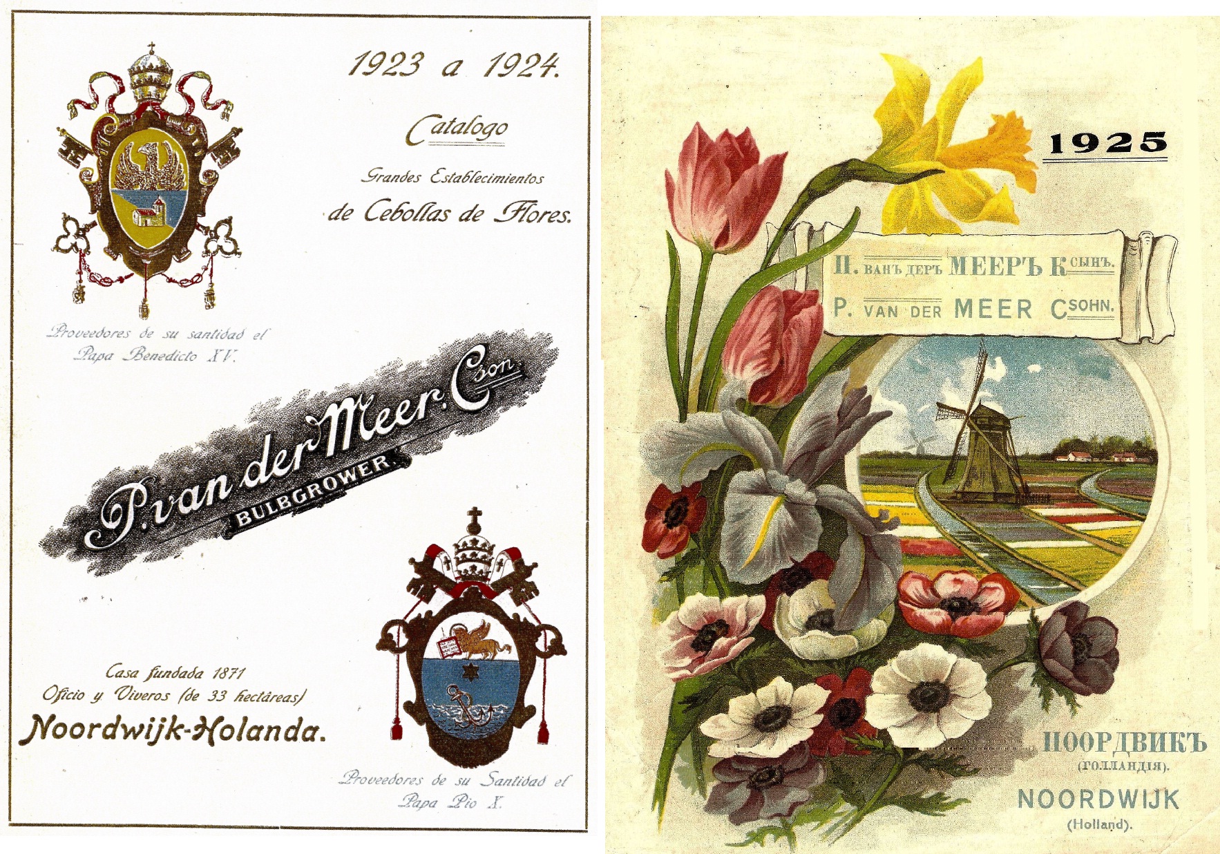 Op de valreep kom je dan nog een site tegen waarop tal van stukken terug te vinden zijn van het nobele bloembollenbedrijf van P. van der Meer aan de Voorstraat en Offemweg in Noordwijk-Binnen. Onlangs hadden we nog het tuinhek te pakken van de firma, maar dit is nog groter dan dat: dit zijn de omslagen van 2 catalogi, een Spaanse en een Russische, want Van der Meer ging ver over de grenzen van het vaderland.