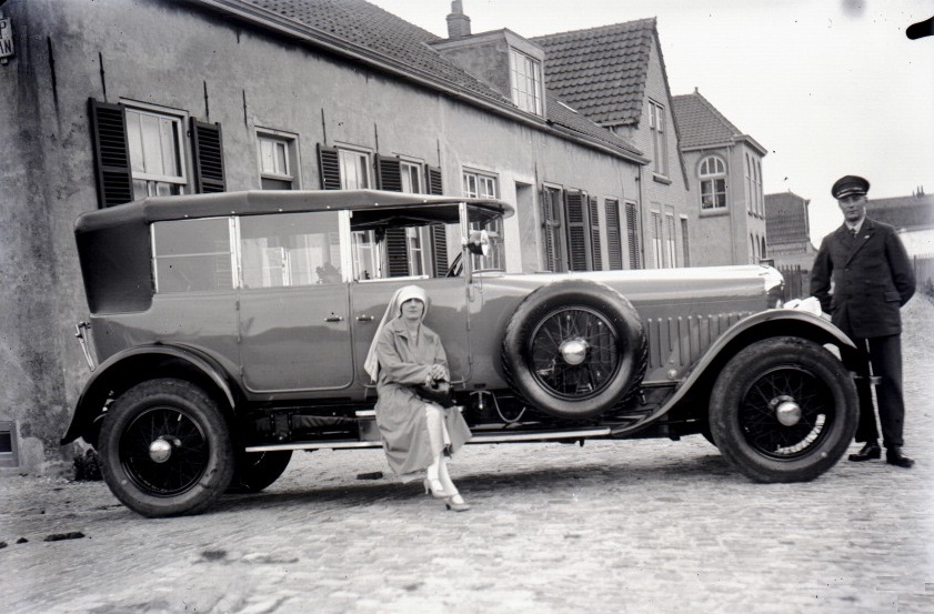 Het Genootschap Oud-Noordwijk koketteert op zijn site met deze prachtige foto, maar geeft verder geen bijzonderheden: waar is de foto genomen, wie zijn die mensen die erop staan (vooral die wat wuftige, kopvoddentaxwaardige dame) en om wat voor (geweldige) auto gaat het hier?