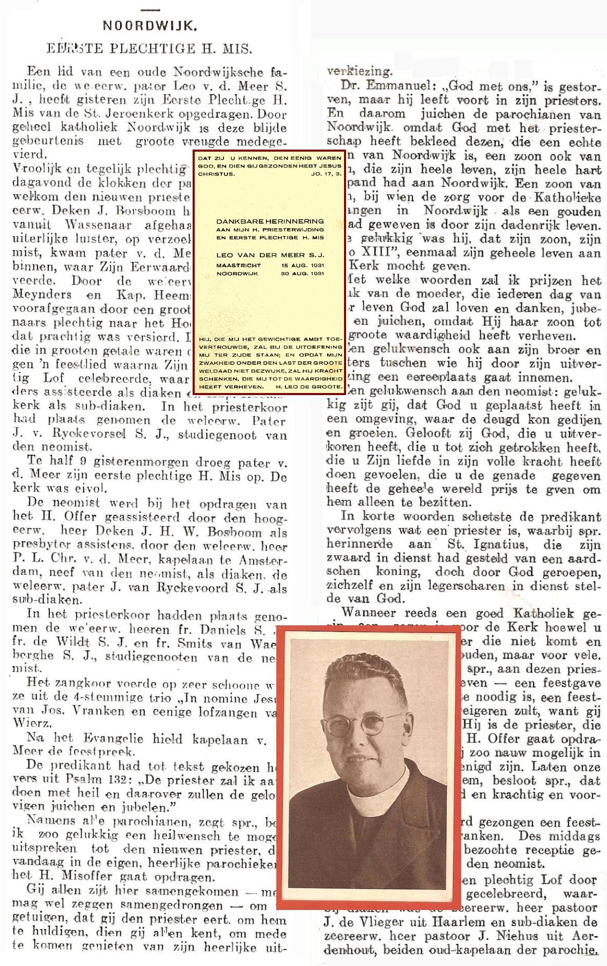 Het is het verslag van de Eerste Heilige Mis die neo-pater Leo van der Meer op 31-jarige leeftijd in zijn oude parochiekerk in Noordwijk mocht opdragen op 30 augustus 1931. Een feestelijke gebeurtenis. Vanzelfsprekend.