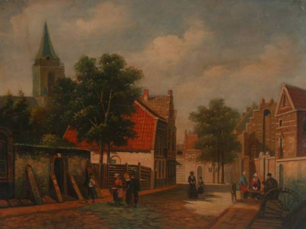 Malerische Straßenszene. Im Stil der alten Niederländer, vermutlich Noordwijk/Holland. Reiche Personenstaffage, feine Details. Öl auf Leinwand auf Holz doubliert, Craquelle. Unsigniert. H 30, B 40 cm. Ungerahmt. (Bij Auktionshaus Ruetten in Duitsland)