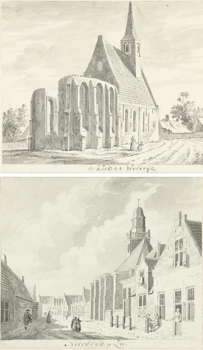 Beide prenten werden overigens gemaakt door Hendrik Tavernier, de bovenste in 1784, de onderste in 1783. Men zou dan wel aannemen dat beide kerken op enig moment tegelijk bestonden. Maar protestants Noordwijk-Binnen had de Grote of St. Jeroenskerk, protestants Noordwijk aan Zee had de kapel op de onderste prent en alle katholieken en doopsgezinden enzovoort zaten rond 1780 in de schuilkerken, die er niet zo ostentatief uitzagen als de kerk op de bovenste prent. Wie moest er in hemelsnaam nog meer in een kerk worden ondergebracht?