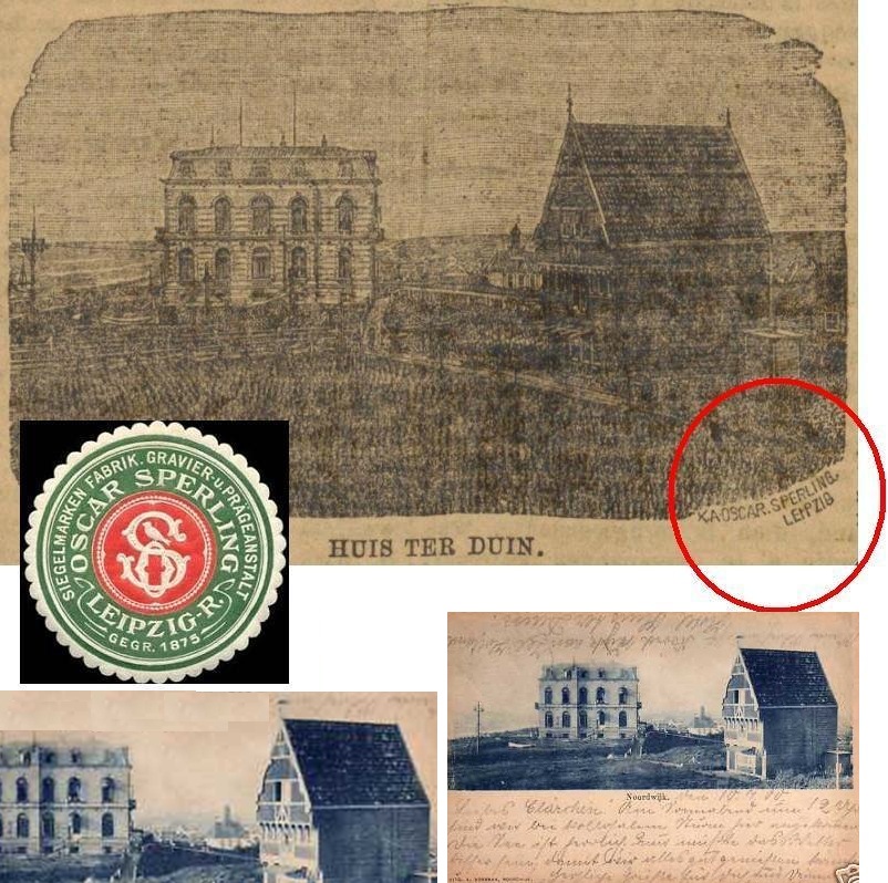 Dat deed het Algemeen Handelsblad dan ook met deze afbeelding van het toenmalige Huis ter Duin met het aanpalende Oud-Holland. De ‘etsplaat’ had men blijkbaar laten maken bij de firma Oscar Sperling in Leipzig. Dat bedrijf was gespecialiseerd in dit soort produkten. Soortgelijke ebdrijven zullen er ook wel in Nederland geweest zijn. Waarom deze beeltenis dan ook helemaal uit leipzig moest komen is onduidelijk. Misschien had de eigenaar van Huis ter Duin, de (Duitser) Heinrich Tappenbeck, de plaat zelf laten maken bij zijn vrinden in Leipzig en hattie ‘m alleen ff uitgeleend aan het Handelsblad.