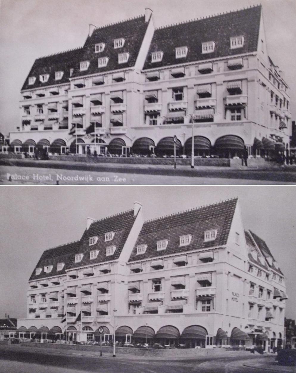 Ik krijg weer 2 intrigerende foto’s aangereikt van het oude Palace Hotel, praktisch op hetzelfde moment genomen, maar toch niet. Op de onderste foto is de fotograaf ten opzichte van de bovenste één pas achteruitgegaan en twee passen naar rechts. Voor de rest is alles hetzelfde.