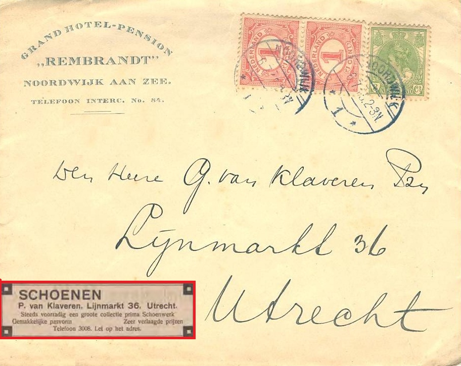 De brief uit het Rembrandt Hotel in Noordwijk ging naar G. van Klaveren, de zoon van P. van Klaveren die een schoenwenwinkel dreef aan de Lijnmarkt in Utrecht.