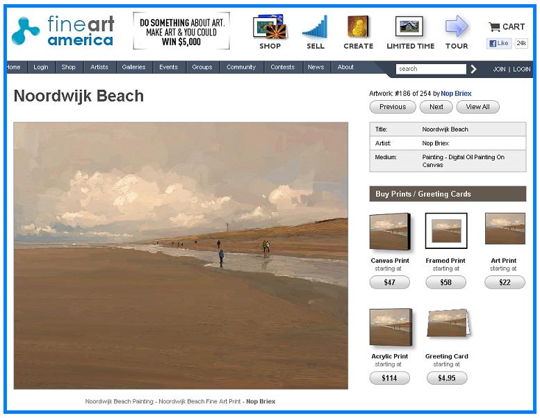 FineArtAmerica.com is een soort van sociaal netwerk en internetverkooppunt voor fotografen, beeldende kunstenaars, kunstgaleries en –verzamelaars. Op de site zijn zo’n anderhalf miljoen (!) kunstwerken te vinden, variërend van schilderijen en plastieken tot ‘mixed media’ en juwelen. Originelen zijn ook verkrijgbaar als reproductie (‘print-on-demand’).