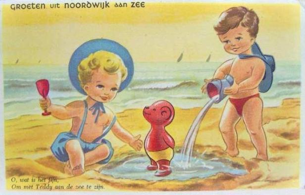 “O, wat is het fijn om met Teddy aan zee te zijn.” Dat is nog maar de vraag. De inmiddels volstrekt rood verbrande baby-ijsbeer (armen op de rug gebonden!) doet nog wel zijn best om te lachen, maar erg prettig moet-ie het toch niet gevonden hebben. Dat geklungel om hem heen van twee kinderen met een schepje en een emmer water. IJsberen hebben doorgaans wel andere genoegens in hun kop.