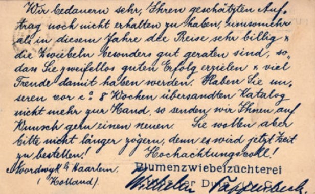 Wir bedauern sehr, Ihren geschätzten Auftrag noch nicht erhalten zu haben, umso mehr als in diesem Jahre die Preise sehr billig und die Zwiebeln besonders gut geraten sind, so dass Sie zweifellos guten Erfolg erzielen und viel Freude damit haben werden. Haben Sie unseren vor ca. 8 Wochen übersandten Katalog nicht mehr zur Hand, so senden wir Ihnen auf Wünsch gern einen neuen. Sie wollen aber nicht länger zögern, denn es wird jetzt Zeit zu bestellen! Hochachtungsvoll! Blumenzwiebelzüchterei Huis ter Duin, Wilhelm Tappenbeck (Noordwijk bei Haarlem / Holland).