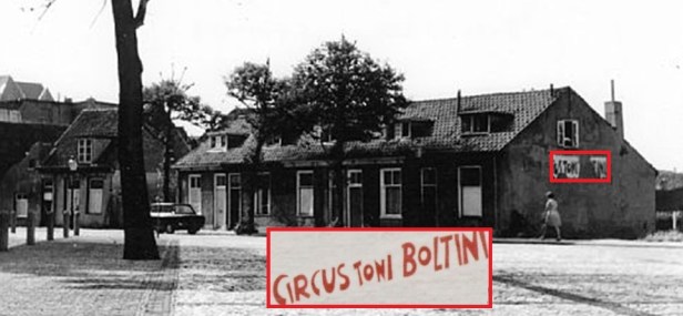Ik kan me niet herinneren dat het Circus Toni Boltini met zijn tent ooit in Noordwijk neerstreek. En als het al gebeurde – zoals deze foto suggereert – moet het lang geleden zijn. Het affiche op het armzalige rijtje huizen aan de Heilige Geestweg is al bijna verdwenen, versnipperd, verregend en verwaaid in de wind.