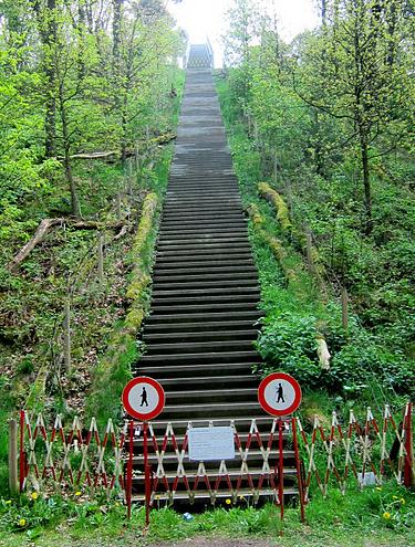 Los van lichamelijk en andersoortig ongerief is daar ook nog de steilte van de trap: je moet hier ook maar omhoog dúrven! De befaamde Noordwijkse kunstenaar, wijlen Krijn Giezen, ontwierp ooit voor de beeldentuin van het Kröller-Muller een trap die eindeloos steil de lucht instak (“Kijk uit Attention!”). Al op de eerste dag gebeurden er ongelukken (een uitkijktoren waar mensen niet uitkeken) en moest de trap – tot op de dag van vandaag – worden afgesloten (zie de foto hieronder).