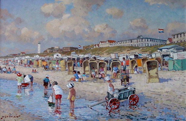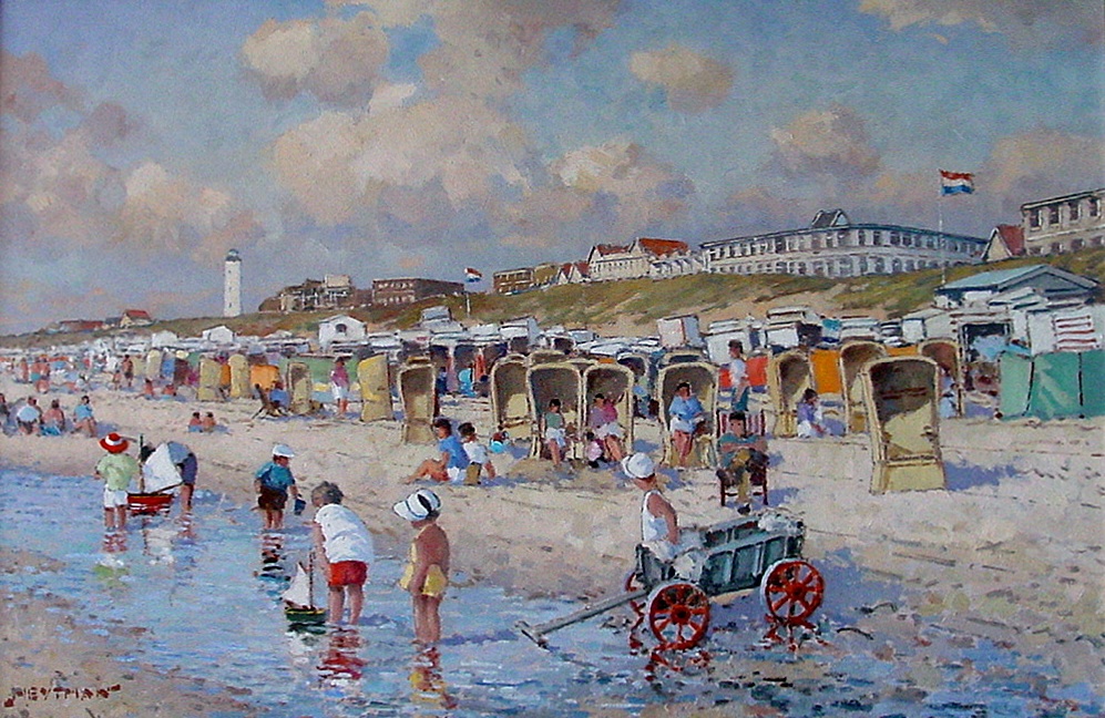 De Zeeuwse schilder Willem Heytman maakt o.a. mooie strandgezichten. Ook van Noordwijk, zoals deze. Als hij dit beeld natuurgetrouw geschilderd heeft, met zijn ezel, palet en kwasten op het strand, dan moet-ie ongeveer 20 jaar oud zijn geweest, want de hotellen Hoek en Hollander in dit beeld zijn rond 1970 afgebroken en Heytman is van 1950. Er is nog meer ‘Noordwijks’ werk van hem.