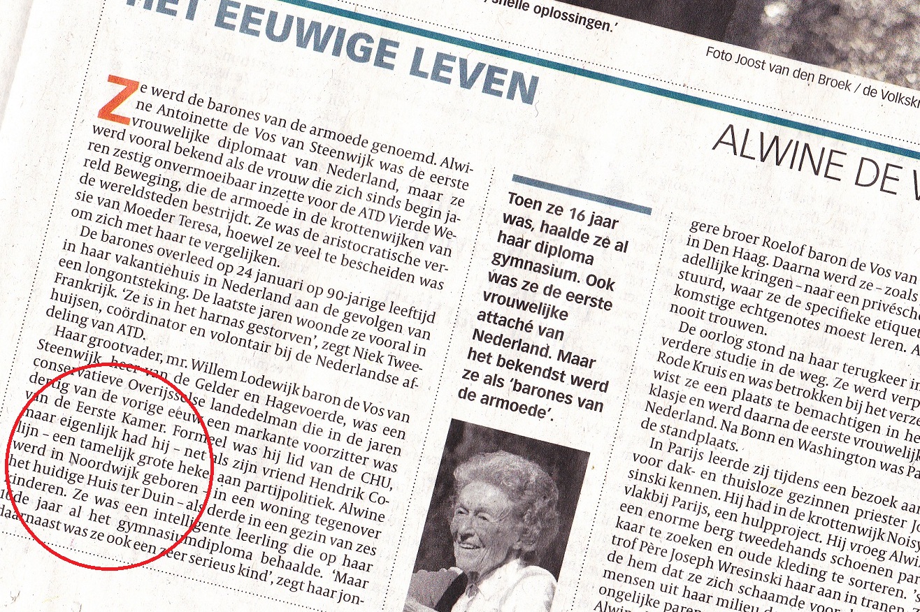 En nu is ook Alwine de Vos van Steenwijk vergankelijk gebleken, zij het pas na negentig jaar. Een bijzondere vrouw, die zoals de Volkskrant terecht allemaal citeert, vroeg haar vwo-diploma haalde en als eerste vrouw doordrong tot de hoogste rangen van de Nederlandse buitenlandse dienst.