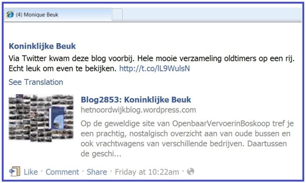Ik ben niet van de Twitter, Facebook, Linkedin, Skype en andere, mij verder onbekende virtuele communicatiemiddelen. Maar nu word ik geattendeerd op het gegeven dat een blog van mijn hand via Twitter terecht komt op Facebook.