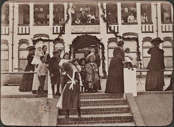 Het was een feest, een groots feest met kinderen in hun mooiste kleren en guirlandes en lampions overal op de balkons. Maar we weten niet om welk feest het nu ging, daar in Pension Noordzee. De opening van het pension zelf? Koninginnedag? Zomaar een zomerfeest? (met dank aan L)