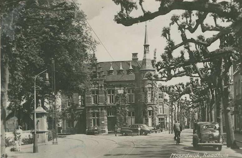 De Voorstraat met raadhuis, ergens aan het begin van de jaren vijftig, schat ik zo in. Curieus is het overdadige gebladerte aan de bomen ter linkerzijde van de weg en het nog maar pril ontloken lover aan de bomen ter rechterzijde. De Voorstraat als scheidslijn tussen lente en zomer.