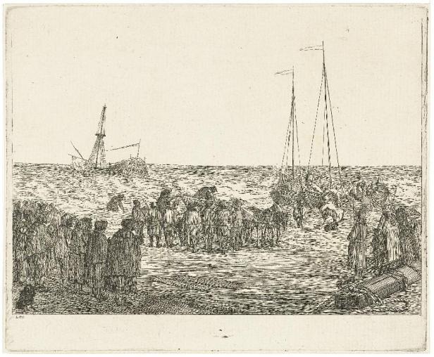 De prent wordt toegeschreven aan Louis Bernard Coclers (1741 – 1817). De ‘Generaal Barker’ verging in 1781 voor de kust van Noordwijk, maar er valt wel een heel verhaal bij te vertellen, o.m. over de bij deze gelegenheid verrichte heldendaden van de Noordwijkse dominee Abraham van Rooyen. Dat ‘hele verhaal’ heb ik al eens eerder verteld en kun je hier terugvinden.