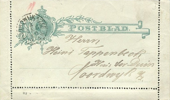 Dit postblad ging op 4 december 1896 toe aan ‘Heini’ (Heinrich) Tappenbeck, eigenaar van Huis ter Duin in Noordwijk aan Zee. En 115 jaar later is deze ‘mail’ blijkbaar nog steeds niet aangekomen, want hij is zomaar te koop op ebay.