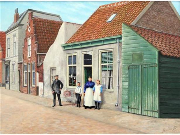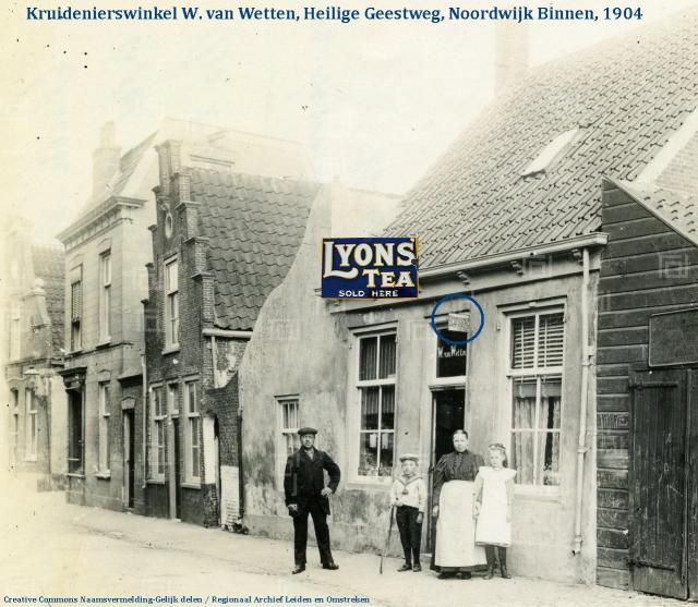 De kruidenierswinkel van W. van Wetten aan de Heilige Geestweg. van Wetten verkocht – naast onder andere Lyons Thee – blijkens het opschrift op het bord rechts ook steenkolen. Ik neem aan dat hij de voorloper / grootvader was van de latere kolenboer Van Wetten, die in de Kerkstraat kwam te zitten? Van de fraaie foto maakte Rob van Assen later een even fraai schilderij: