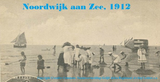 De kaart is volgens het bijschrift in Noordwijk genomen en heeft gelopen in 1912, maar dat wil niet zeggen dat de foto ook in dat jaar genomen is. Hij lijkt me eigenlijk ouder, zeker afgemeten aan die badkoets die daar rechts in zee geparkeerd staat: een badkoets in die beschildering was ik in de annalen van de badplaats nog niet tegengekom