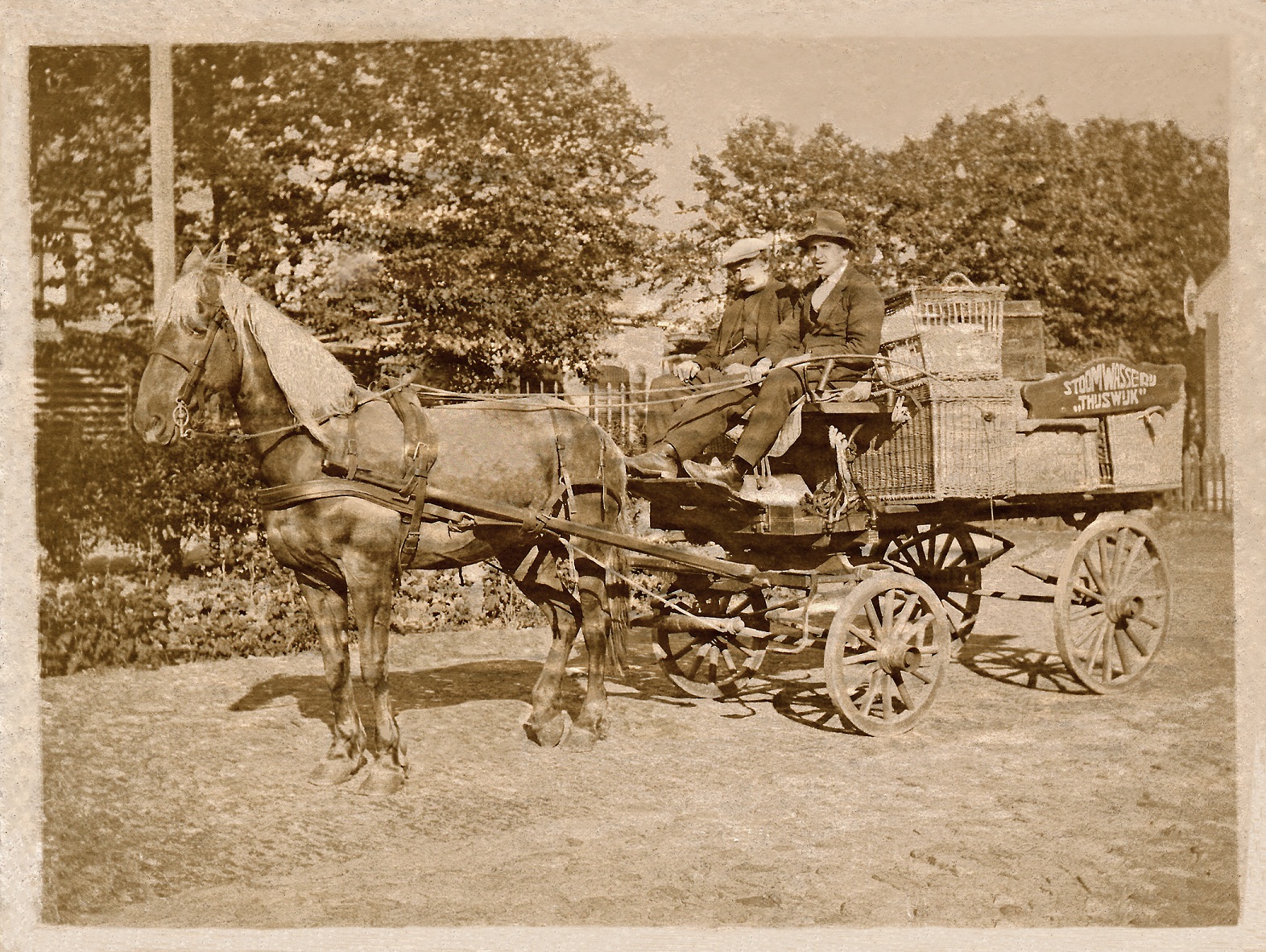 Ik had onlangs een blogje van de Eerste Noordwijksche Stoom Wasch- en Strijkinrichting “Thijswijk” aan de Pickéstraat annex Achterzeeweg in Noordwijk Binnen. Nu krijg ik van Ron een foto die nog eens een keer bewerkt is en zo voor het nageslacht gered door Willem (dank aan beide heren!): de ophaal- en bezorgdienst van de wasserij: een kittig paardje, op de wagen mooie rieten manden voor het was- en strijkgoed en twee oudere heren aan wie je je uitzet wel wilt toevertrouwen. Stoomwasserij “Thijswijk”, ergens anno 1920 vermoed ik (het jaar van oprichting van Thijswijk). Maar de foto is niet gebonden aan enig jaartal: hij is simpelweg tijdloos, tijdloos mooi (twee keer klikken op de foto).