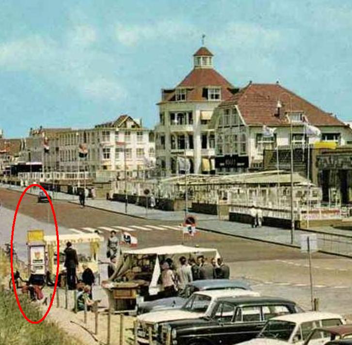 Hier gaat het om die prachtige brievenbus van het Rode Kruis die er als een soort neutralisator altijd tussen stond. Je kon er overbodig geworden boeken en tijdschriften in kwijt, bedoeld voor de bedreigde gebieden. Als we naar het strand gingen moesten we van ons moeder wel eens een stapeltje oude Margrieten en radiogidsen meenemen en die hier deponeren. Daartoe worstelden wij ons tussen de vis- en aardbeienluchten door en lieten het stapeltje met een plof in de bus vallen.