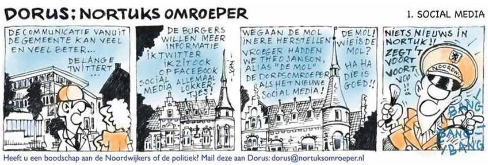 Ik vind in “De Noordwijker” van afgelopen week een mooie strip (kwee-nie-van-wiens-of-wier-hand). De strip refereert aan Dorus Mol, alias Theo (?) Janson, die in vroeger tijden als dorpsomroeper door het leven ging en verder wat bijverdiende met folderen voor Dancing Duna-Deli. Daarnaast in mijn herinnering een uitermate goedmoedige man en een ‘sociaal medium’ avant la lettre.