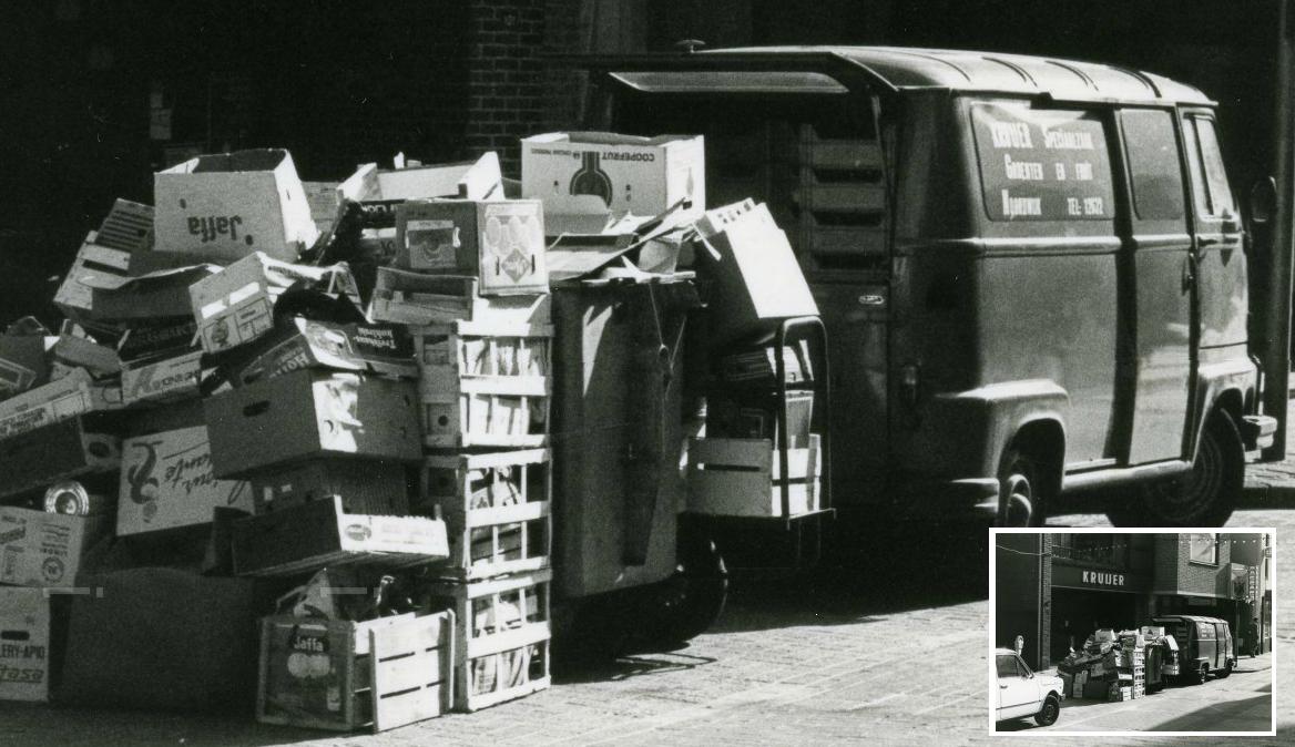 We blijven nog even in de Hoofdstraat en komen terecht bij “Speciaalzaak Groenten en Fruit Kruijer”. Kruijer moet nog amechtige pogingen doen om alle afval en lege dozen in zijn Renault Estafette te krijgen. Het ziet er naar uit dat het hem niet gaat lukken.