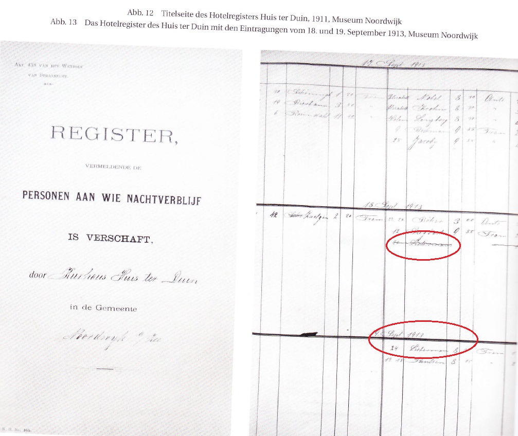 Am 19. September 1913 war das Huis ter Duin fast leer. Die wenige Gäste, die noch nicht abgereist waren, hatte man aus den Nebengebäuden ins Haupthaus gebeten. Trotzdem war von den siebenundsechzig Zimmern nur noch ein Drittel belegt. Der prominente Stammgast aus Berlin, Professor Liebermann, an diesem Freitagmorgen früh im Aufbruch begriffen, war erst sechs Tage zuvor in das Zimmer 24 gezogen, das bis dahin andere Gäste beherbergt hatte. Bei seiner Ankunft am 12. August hatte man ihn in der etwas mehr landeinwärts gelegenen Villa Briesen untergebracht. Das unerwartet häufige Kommen und Gehen während des quirligen Sommers hatte dazu geführt, dass das offizielle Hotelregister schon am 6. September, drei Wochen vor Ende der Saison, voll war. Provisorisch wurde in das Buch acht Seiten eingeklebt, auf die man mit Feder und Lineal senk- und waagerechte Striche zog, um die notwendigen Spalten und Fächer zu erhalten, in die man die Zimmernummer, den Namen des Gastes, die Uhrzeit seiner Abreise, die Art des von ihm benutzten Verkehrsmittels und die Anzahl der Personen eintragen konnte.