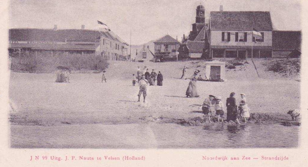 Dit is weer eens zo’n kaart die ik nooit eerder tegengekomen ben (maar ik zie er ook wel eens eentje over het hoofd). Het lijkt mij een hele vroege foto van het strand aan het einde van de 19e eeuw. Te zien aan de kleding, maar ook vanwege het gemis aan een batterij badkoetsen. Maar is het ook de allerallerallervroegste foto van ‘Badplaats Noordwijk’? Wat is eigenlijk de vroegste foto van ‘Badplaats Noordwijk’? Is zo’n foto al eens gelokaliseerd en gedateerd aan de hand van jaarringen en koolstofanalyse? Wie het weet mag het schrijven.