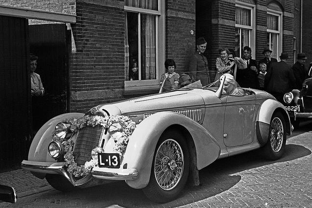 Dat jongetje half in de poortopening links is nog aan het bijkomen van de shock: je doet de poort open en er staat een waanzinnige auto voor je neus, zo eentje die je nog nooit hebt gezien. En daarin de HKH De Kroonprinses van Alle Nederlanden met haar wettige echtgenoot Bernhard Leopold Frederik Everhard Julius Coert Karel Godfried Pieter, Prins van Lippe-Biesterfeld (nog een godswonder overigens dat je met zoveel namen in zo’n cabriootje past).