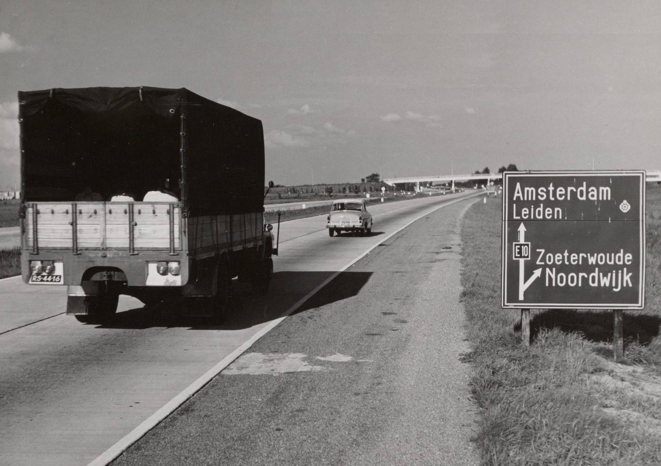 Er wordt veel gedebatteerd over een betere verbinding tussen de A4 en de A44 (een tunnel of een verdiepte weg dwars door Voorschoten? Een verdiepte Churchilllaan in Leiden?). In 1959 waren die debatten ook nog niet aan de orde. Je kon gewoon van hier naar Noordwijk. Leiden was een afslag verder (Hoge Rijndijk, ook al geen pretje meer tegenwoordig om de stad in te komen).
