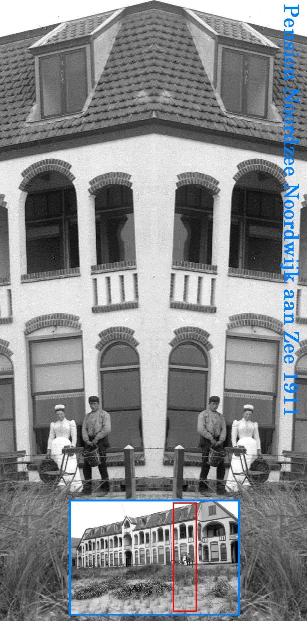 Ze stonden daartoevallig op dat ene moment dat de fotograaf er een foto wilde maken. Die fotograaf stoorde zich niet aan hen, hem ging het om het pas geopende pension Noordzee. De fotograaf gebruikte glasplaten, een techniek die voor die tijd een ongekende scherpte aan foto’s meegaf. Kweetniethoeveel megapixels, als dat toen al pixels geheten heeft.