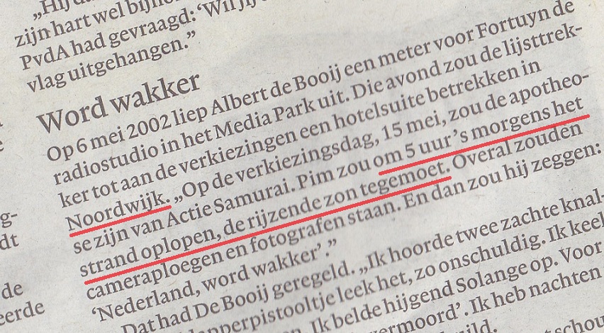 De Booij was er ook bij toen Fortuyn in het Mediapark in Hilversum, op weg naar zijn auto, werd vermoord. Hij vertelt erover in het interview en en passant onthult hij een paar dingen die ík althans niet wist. Zoals dat Pim Fortuyn vanaf het Mediapark koers had willen zetten naar Noordwijk. Zoals dat hij zich daar gedurende enkele dagen zou terugtrekken in afwachting van de verkiezingsuitslag. Zoals dat hij op de verkiezingsdag een show zou opvoeren op het Noordwijkse strand, ’s morgens om 5 uur, in een laatste apotheotische poging Nederland nog verder voor zich te winnen. Het is allemaal niet zo ver gekomen.