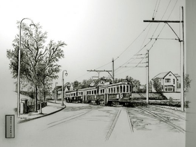 Marja van Steijn maakt mooie muurschilderingen en –tekeningen. Deze – de Blauwe Tram die afdaalt naar Noordwijk-Binnen – schijnt gemaakt te zijn voor Het Trefpunt in Noordwijk aan Zee.
