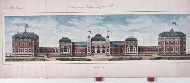 Dit is het Noordwijker Kurhausontwerp van H.P. Berlage, in 1883 nog maar 27 jaar oud. Twee keer klikken op de afbeelding en het ontvouwt zich in alle pracht (zie site TU Delft).