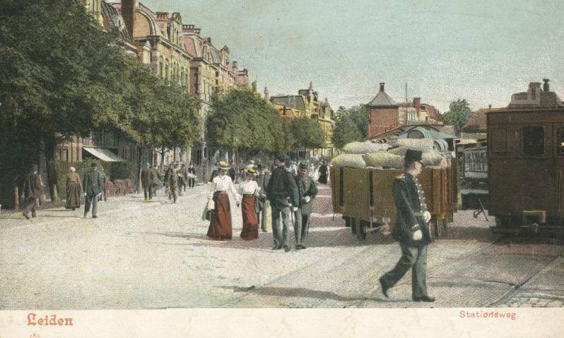 Mooie ingekleurde foto van het tramemplacement aan de Stationsweg in Leiden ergens rond 1900. Veel bedrijvigheid en drukte. De stoomtram uit Noordwijk is net binnengekomen of staat op het punt weer naar Noordwijk te vertrekken.