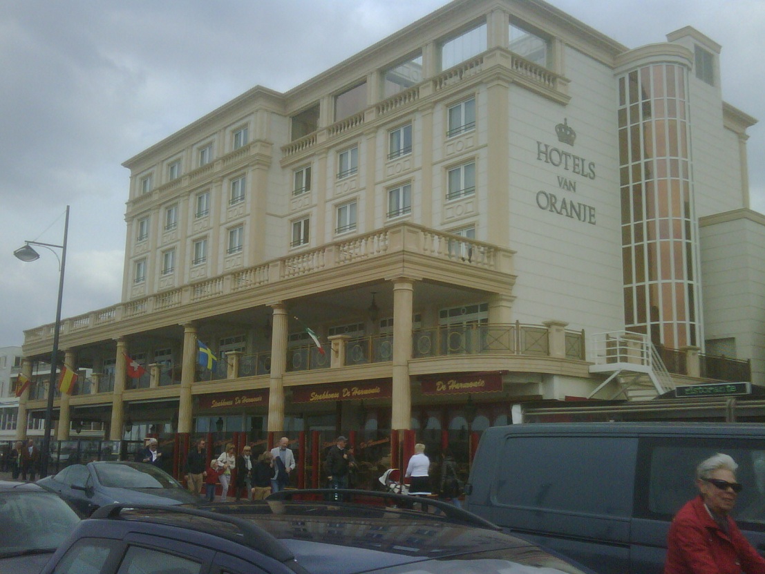 Langs de Hotels van Oranje over de boulevard. Wanstaltiger architectuur is toch nooit bedacht of uitgevoerd, vrees ik. Amai! Het nieuwe gedeelte is van een postmodernistische prots waar je geen weet van wilt hebben, de oude Zeeleeuw is verdwenen achter witte bakstenen en oranje ramen en het zogeheten ‘Elfde Gebod’ roept automatisch een ‘Twaalfde Gebod’ op: subiet neerhalen die tent en afvoeren naar de gallemiezen!