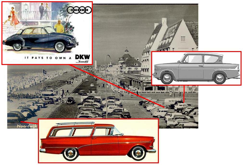 Er zijn talloze foto’s van deze plek genomen, door de jaren heen. En op iedere foto kom je weer andere automodellen tegen uit alle tijden. Eén groot virtueel automuseum. Ik pik drie modellen uit deze foto weg: de Opel Olympia Rekord Caravan, een geliefde bak bij bollenboerend Noordwijk-Binnen, een DKW/Auto Union, geliefd bij de Duitse toerist uit het Ruhrgebied en de Ford Anglia. Drie verschillende types uit ongeveer dezelfde tijd.