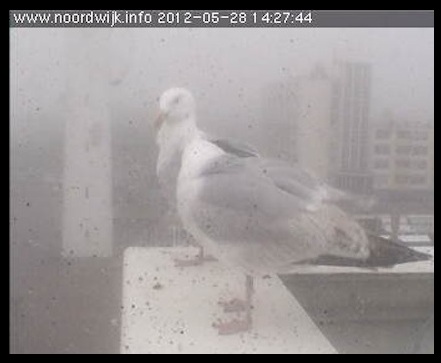 Vandaag in Nederland vrijwel overal prachtig weer. Niet aan de kust van Zuid-Holland, waar een lelijke zeevlam ook Noordwijk onderdompelde in mist en kou. Deze webcamfoto getuigt ervan. Genomen op Tweede Pinksterdag 2012, kort voor half 3 (met dank aan Li-st)