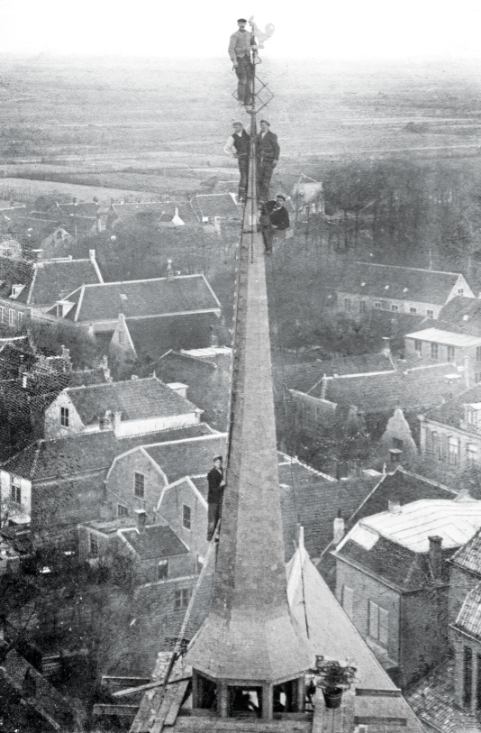 Helemaal arbo -verantwoord was dit allemaal natuurlijk niet. Ik krijg zelf al hoogtevrees als ik ernaar kijk. Geen helmen, geen schoenen, geen zekeringen, geen relingen, helemaal drie keer niks. Deze gasten gingen gewoon de lucht in, via een paar losliggende steigerplanken, een zelfgetimmerde ladder, wat uitsteeksels enzovoort.De pet hielden ze gewoon op, het ontbrak er nog maar aan dat ze op klompen naar boven liepen. Ze hielden zich vast aan het ijzerwerk van de haan die al op de spits was geplaatst. En ze kwamen ook wel weer veilig naar beneden.