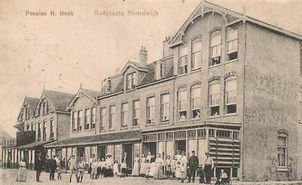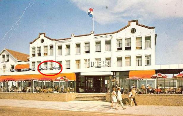 Hotel-restaurant Hoek aan de Noordboulevard van Noordwijk had een grote naam en een lange traditie op te houden. Familiehotel bij uitstek fungeerde het jarenlang als geliefde pleisterplaats en als markant gebouw aan zee. Toen de toeristenbusiness in Noordwijk langzaam achteruit holde ( 🙂 ) moest ook Hoek pogen het vege lijf te redden. Dat deed het door een strakke, zij het wat zielloze nieuwe aanbouw te plaatsen aan de voorkant van het gebouw in de hoop dat dit modernisme de Nieuwe Toerist zou aantrekken. Ook een vrolijke markies en een wat hoekige belettering moesten daar blijkbaar aan bijdragen. Het hielp uiteindelijk allemaal niet, hotel-restaurant Hoek is inmiddels al jaren geleden ter ziele gegaan.