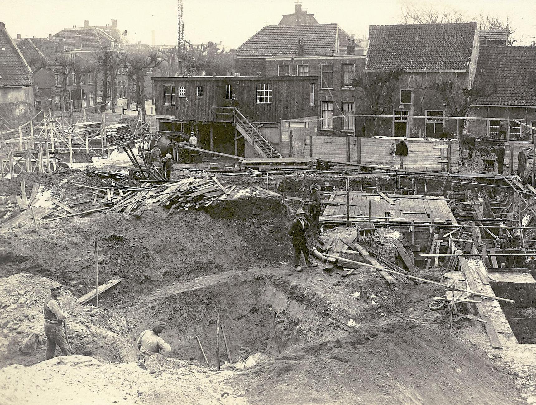 Een geweldig rijke foto (2x klikken) van de bouw van de nieuwe Sint Jeroenskerk aan de van Limburg Stirumstraat in Noordwijk-Binnen. Het is ergens aan het begin van de jaren twintig van de vorige eeuw. Bouwvakkers zijn op alle mogelijke manieren bezig met de fundering. Diepe gaten voor de fundering van de pilaren van de kerk, daarachter is alles al volgestort in een slordige bekisting. Rechts liggen al gereedgekomen basiselementen. Links draait de betonmolen met kruiplanken voor de aanvoer van de kiezels die rechtsboven gelost worden. De prachtige bouwkeet. Het is één en al bedrijvigheid, maar ook ongezonde chaos. De bouwplaats ziet er niet uit, vergeven van de verkeerde hopen zand, losliggende planken. Links voor wordt al gebouwd (aan de pastorie?), de steigers liggen klaar (met dank aan KB).