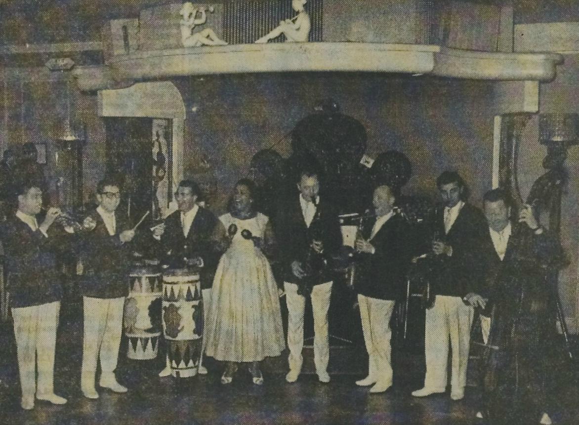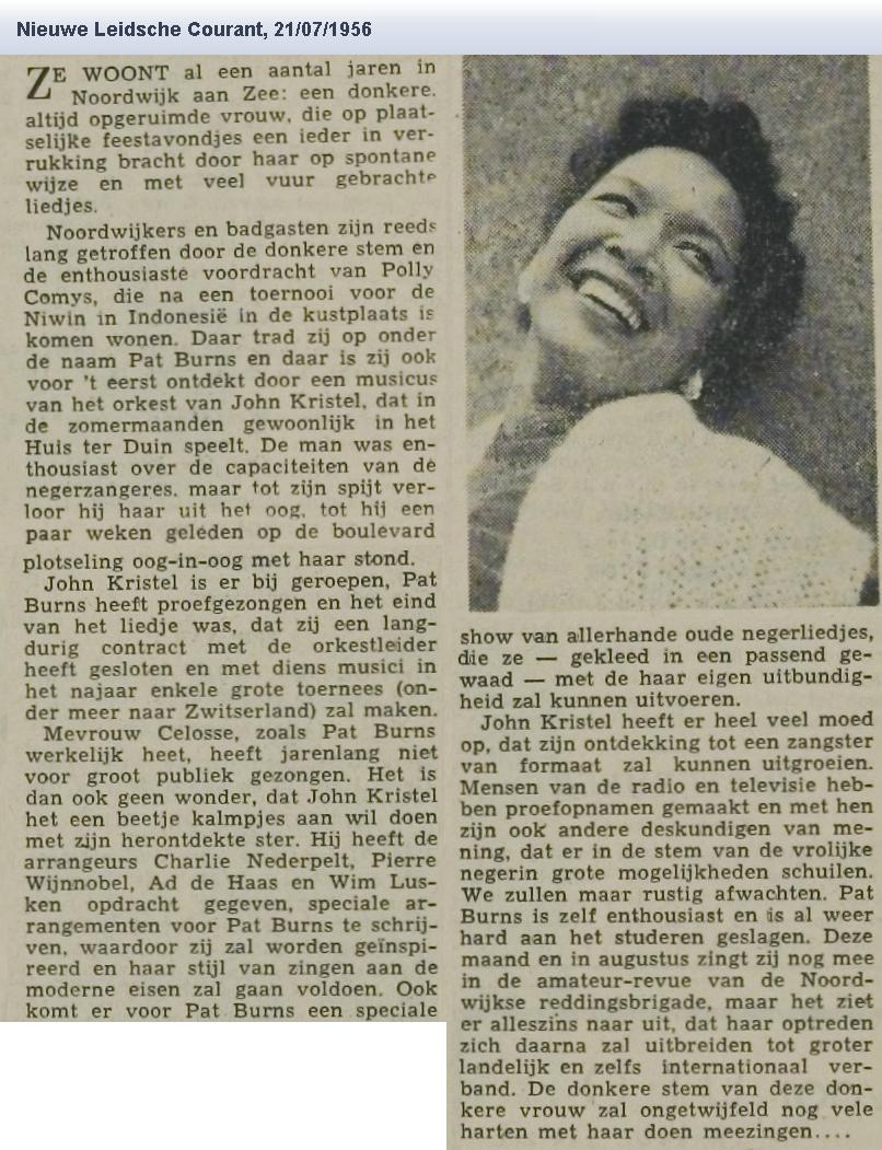Midden op de foto staat Pat Burns, hier als zangeres met het orkest van John Kristel in Huis ter Duin. Kristel (rechts op de foto met contrabas) had haar eigenhandig ontdekt, maar tot een hemelbestormende carrière heeft het allemaal niet geleid. Pat Burns, die eigenlijk ‘mevrouw Celosse heette en in Noordwijk ook ‘Poly Comys’ werd genoemd, schijnt één keer te hebben opgetreden op de AVRO-televisie, maar verder brachten haar optredens haar nauwelijks buiten Noordwijk (bij Ton Bakker in Wassenaar aan de Deyl deed ze ook wel eens een schnabbel). Voor zover de kranten over haar berichten, blijft het allemaal lokaal nieuws. Deze ‘negerzangeres’ (zoals ze óók genoemd werd) trad in Noordwijk wel op met gelegenheidsbands als ‘The Ebony’s’ en ‘The Northsea Jazz Companions” in Duna Deli en bij De Zinger. Maar ze schrok ook niet terug voor optredens met kleermaker-komiek Wijnand van der Weyden (die met behulp van een onnavolgbaar spierenstelsel gekke bekken kon trekken) en de goochelende politieman Frans Vink. Er moet ook een optreden zijn geweest met de Noordwijkse familie – Von Trapp – Kortekaas, maar veel meer zat er blijkbaar niet in het vat. In de Leidse regiokranten wordt nog tot in 1980 gewag gemaakt van optredens, maar daarna is het helemaal stil geworden. Ook op internet is verder niks te vinden over Pat Burns, noch over mevrouw Celosse en Poly Comys. Jammergenoeg ook geen opgeleukte glamourfoto met handtekening en beschaafd decolleté.