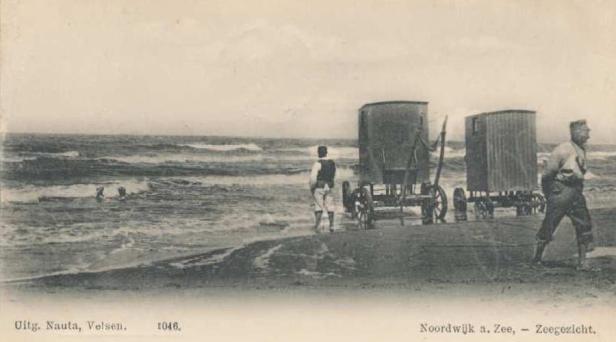 Twee badgasten zijn net in zee ‘gelost’ vanuit de badkoetsen. De badman ziet erop toe dat ze niet in de golven of een mui verdwijnen, Iemand anders met een onduidelijke functie heeft het allemaal wel gezien en beent gedecideerd het strand weer op.