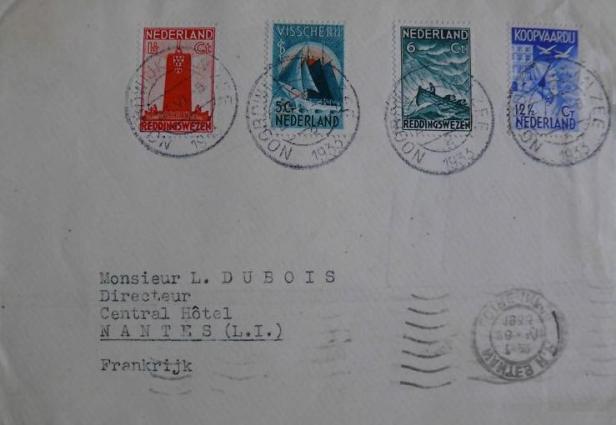 De zegels waren ontworpen door P.Kramer en vormden een serie van toeslagzegels ten behoeve van enkele verenigingen die met de scheepvaart van doen hadden. Twee ervan waren bedoeld voor het reddingwezen. Als je – zoals hier – die zegels kocht en verstuurde, werd een klein gedeelte ervan beschikbaar gesteld aan de desbetreffende vereniging. Van de zegel van 1½ cent kwam een gedeelte ten goede aan de Koninklijke Noord- en Zuidhollandsche Reddingsmaatschappij voor de oprichting het latere monument in Den Helder. Van de zegel van 6 cent kwam een gedeelte terug naar de KNZRM zelve. Als je dus in Noordwijk zo’n postzegel op je envelop likte, kregen ook de Noordwijkse redders er dus iets van terug.