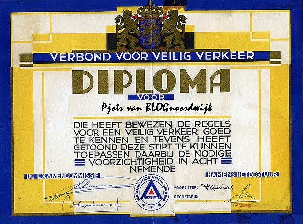 Het was het eerste diploma dat ik ooit van mijn-lang-zal-ze-leven behaald heb. Eén rondje fietsen door het dorp, Lijnbaanweg, Pickéstraat, Bronckhorststraat en via de Zestraat weer terug naar school. Op tijd je hand uitsteken en zorgen dat je achterlicht het deed en in het algemeen “de nodige voorzichtigheid in acht nemende“. Weinig auto’s toen op straat, dus een makkie was het wel. Ik geloof niet dat er iemand gezakt is. Je kreeg een voorbedrukt, in helse blauw-gele kleuren gedrukt getuigschrift.