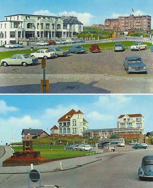 Als je goed kijkt zie je op beide kaarten dezelfde auto’s staan. De fotograaf had zich er weer een beetje van af gemaakt, er de kantjes van afgelopen. Luiheid, anders kun je het niet noemen. Nadat hij de bovenste foto gemaakt had, deed hij een paar passen naar achteren en een paar passen naar links. Toen schoot-ie nog een keer. Ontwikkelen, afdrukken en rechtstreeks in de schappen ten behoeve van het argeloze toeristendom.