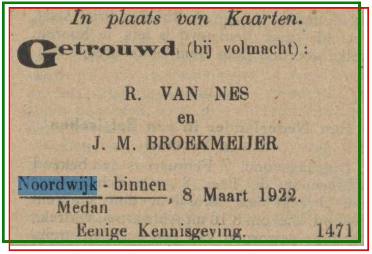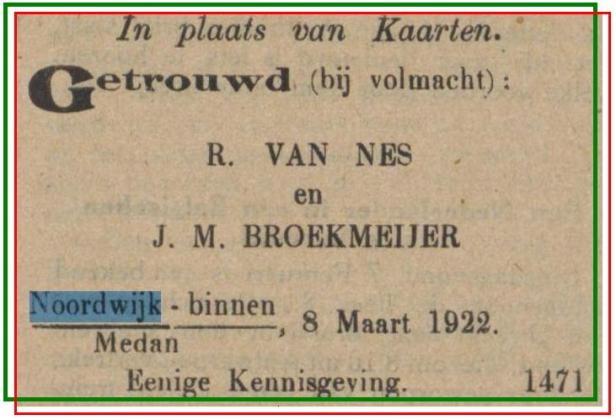 Het bericht is uit de Sumatra Post van 9 maart 1922. Johannes Martin Broekmeijer, geboortig uit Haarlem, trouwde 31-jarige leeftijd met Maria (‘Ria’?) van Nes, dochter van dokter Hadriaan van Nes. Maria was toen nog geen 20 jaar. Johannes zat in Medan op Sumatra, waar hij werkzaam was als ‘secretaris’ (van een handelsonderneming, bij het koloniaal bestuur?).
